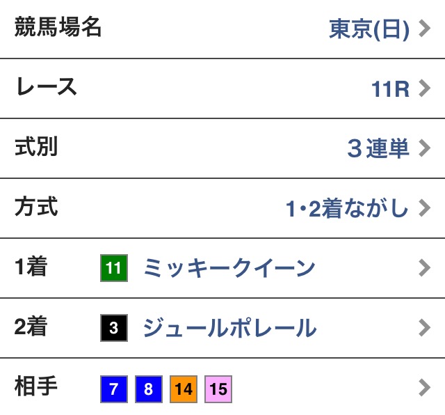 京王杯スプリングカップは、8歳の駄馬が頑張ってしまって残念な結果に・・・ もう全く当たる気がしません!(笑) なので今回の予想は、まぁミッキークイーンは鉄板だよな?問題は2着だよね〜ってことで、好きな数字の3番のジュールポレールにして、3着は適当に入れました。予想でも何でもない!一種のくじだと思って購入!
