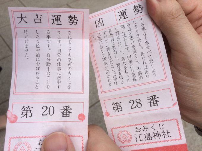 大吉! 2017/7/3 日常生活 江島神社でおみくじを引いたら大吉が出た!!人生初かも!?引いたことあったとしても、記憶のない子供の頃とかかな。今の俺は、クラピカで例えるならエンペラータイム中だぜ!?w