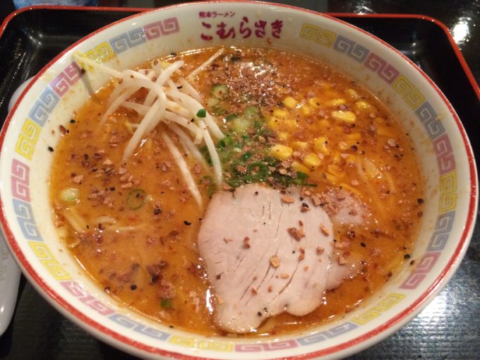 熊本ラーメンの「こむらさき」。味噌とんこつラーメンを注文。薄いとんこつ味にニンニクチップが沢山入ってる。好みの味ではなかったなぁ。やっぱとんこつは濃厚なやつが好きかな。薄過ぎて物足りない感じ。